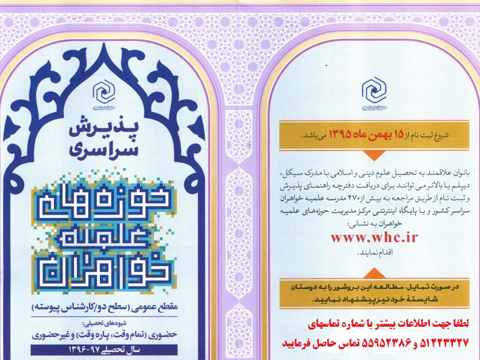 بانوان علاقمند به تحصیل علوم دینی و اسلامی با مدرک سیکل، دیپلم یا بالاتر می توانند برای دریافت دفترچه راهنمای پذیرش و ثبت نام از طریق مراجعه به حوزه علمیه خواهران آستان مقدّس حضرت عبدالعظیم علیه السّلام و یا پایگاه اینترنتی مرکز مدیریت حوزه های علمیه خواهران به نشانی WWW.WHC.IR اقدام نموده و برای کسب اطلاعات بیشتر با شماره تماسهای 51223327 و 55952386 تماس حاصل فرمایند.