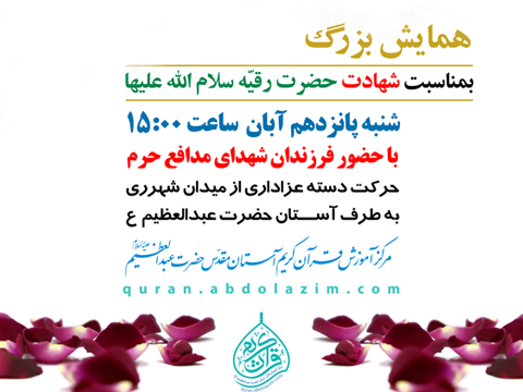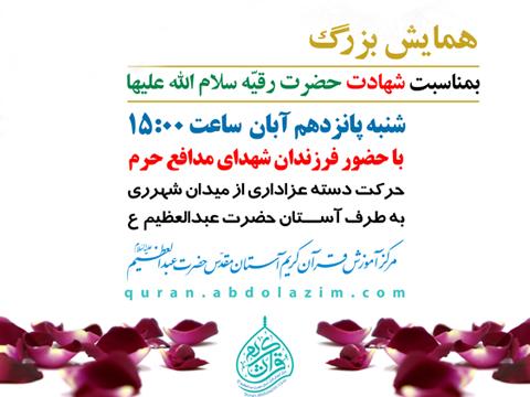 به گزارش اداره ارتباطات آستان مقدّس حضرت عبدالعظيم عليه السّلام، در این مراسم قرآن آموزان مرکز آموزش قرآن کریم به همراه خانواده ساعت 15 با تجمع در میدان حضرت عبدالعظیم علیه السّلام و با دریافت پرچم و سربند با قرائت اشعاری در رثای حضرت رقیه (س) به سمت آستان مقدس حرکت کرده و در ساعت 16 با حضور در صحن اصلی آستان مقدس و برپایی عزا ، عشق و ارادت خود را به ساحت پاک و نورانی فرزند سه ساله ی سیدالشهدا(ع) ابراز نمودند.