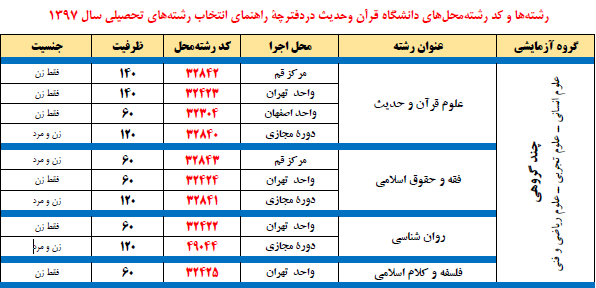معاون آموزشی و پژوهشی دانشگاه قرآن و حدیث با اشاره به مهلت ثبت نام تصریح کرد: علاقه‌مندان از ۱۵ مرداد ماه ۹۷ فرصت دارند با مراجعه به پایگاه اینترنتی سازمان سنجش آموزش کشور و طبق جدول ذیل یکی از کد رشته محل‌های این دانشگاه را انتخاب کنند.